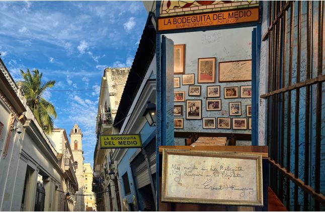 We were standing in Empedrado Street in Havana. Through an open door we could see some free seats at the bar. The bar was originally called Casa Martínez, but since it was the bar in the middle of the street quarter, it came to be called Bodeguita del Medio by the locals.